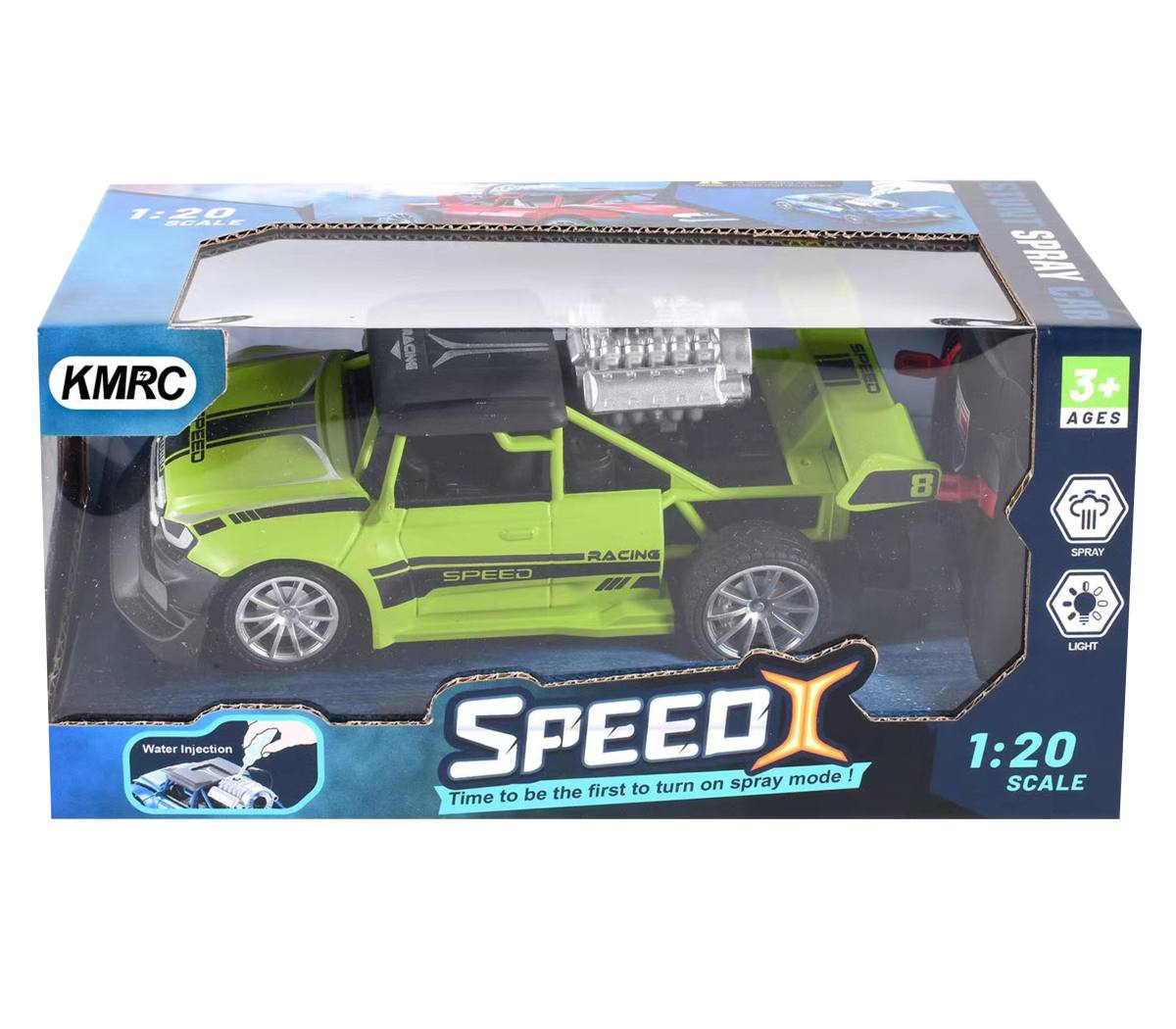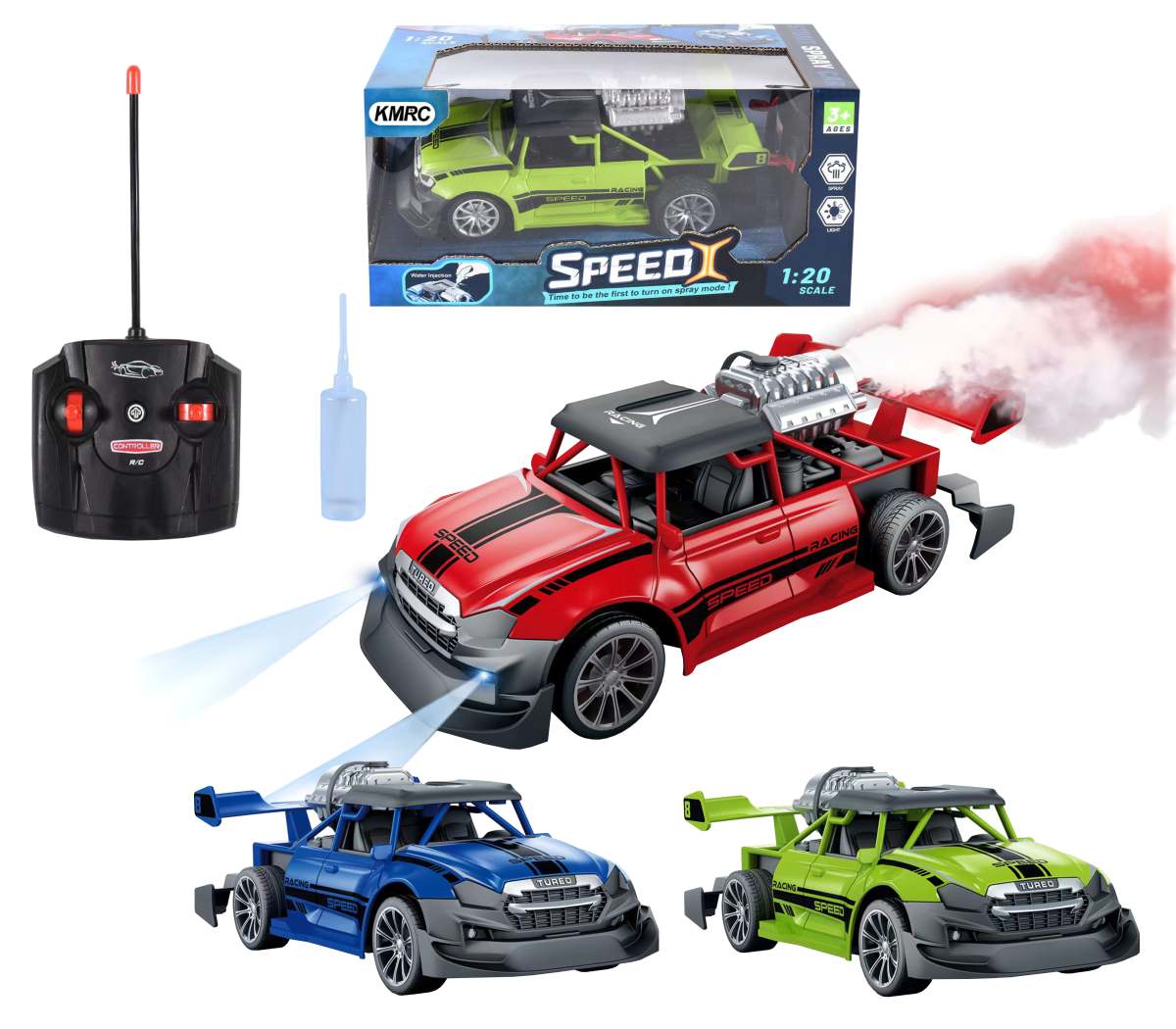 SPEED-X Auto RC dýmící 1:20 jazdí všetkými smermi, svieti a po naliatí vody do nádržky bude reálne vypúšťať paru. Auto vyžaduje 3ks 1,5V AA a ovládač 2ks 1,5V AA batérií, nie sú súčasťou balenia. Možnosť výberu z troch farieb.